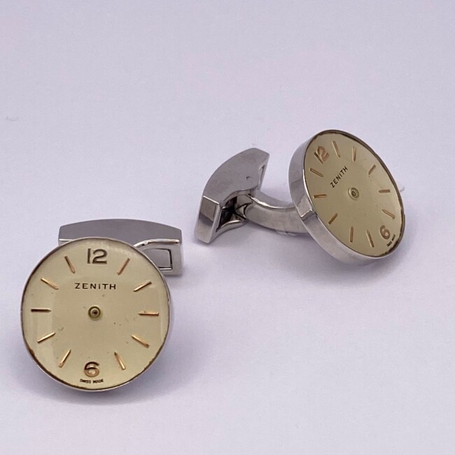 Boutons de manchette à mouvement de montre Omega forme tonneau.